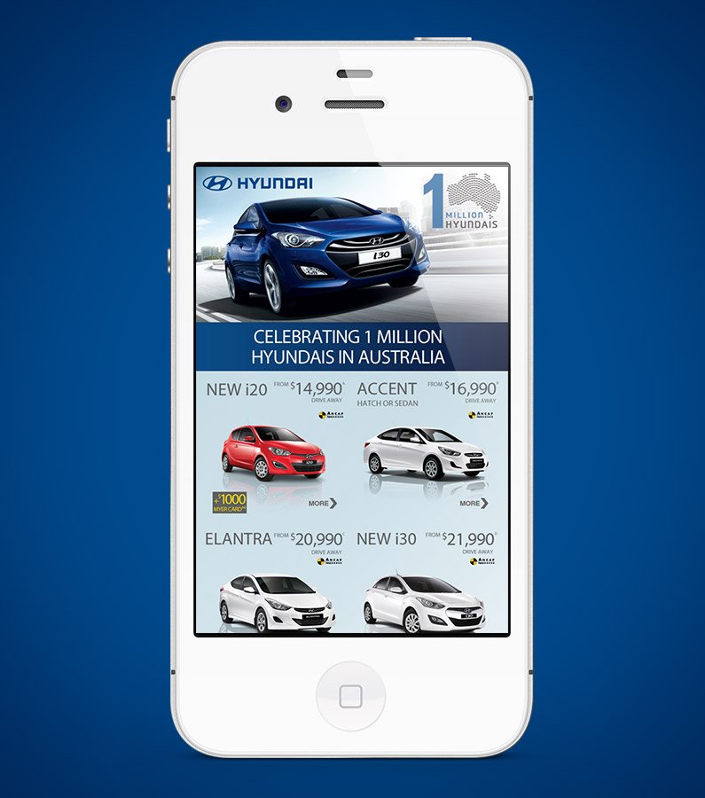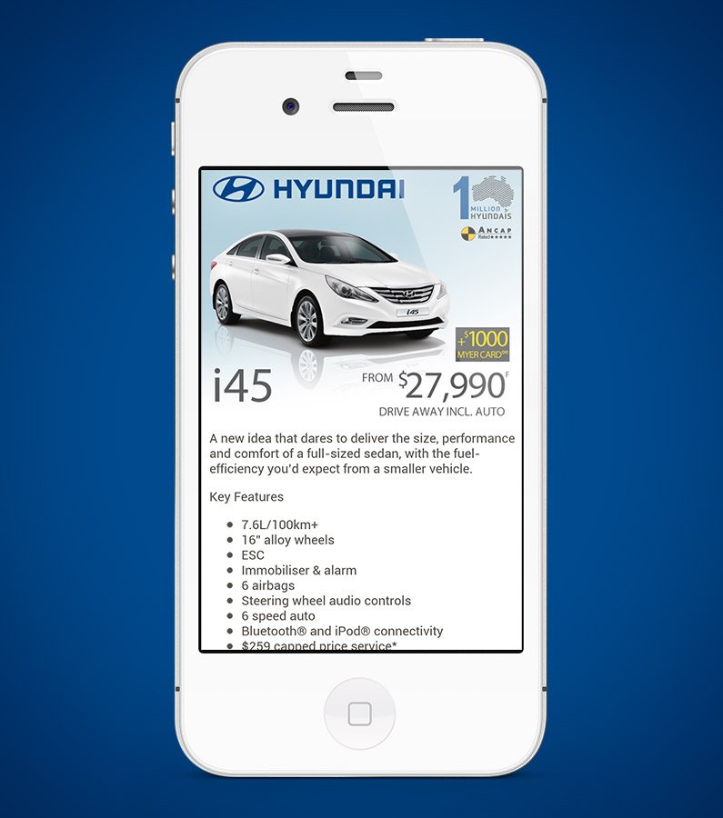 I created this mobile website at Mobile Embrace for Hyundai Australia. The site was built from Hyundai’s print catalog, they supplied an InDesign file and assets which I converted into the site.