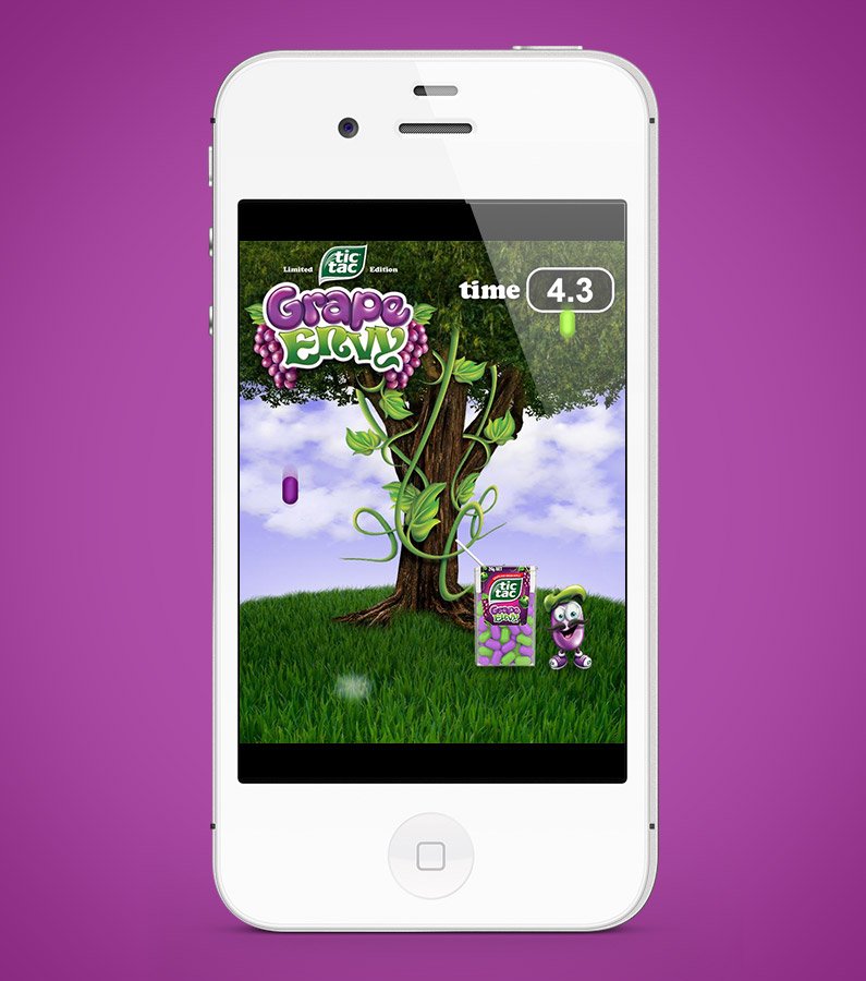 I created this game at Mobile Embrace for Ferrero. I created the initial concepts, designed and built the game. The game end with a video sequence captured from the Tic Tac Grape Envy television commercial.